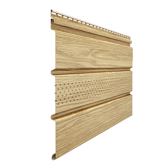 Миндаль - новый сочный оттенок в линейка сайдинга Дёке Люкс, рекомендуем стены такого цвета дополнять подкровельными софитами, однако, хорош он будет и со светлыми стенами.