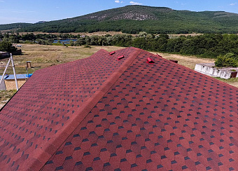 Коньково-карнизная черепица цвета Клубника подойдет для завершения образа крыши выполненной в различных тонах. Оригинальное исполнение позволит оформить необходимые элементы с высокой точностью. Высокое качество материала и креплений защитит конструкцию от перепадов атмосферных температур и ветра. Насыщенный тон битумных листов оттенит основной покров и создаст аккуратный вид.