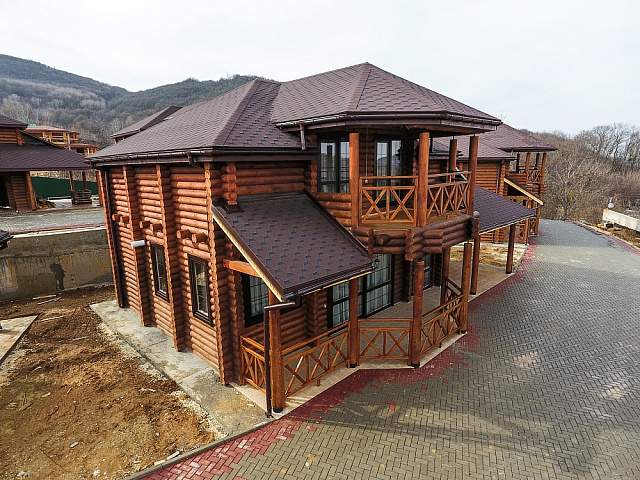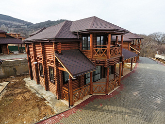 Гибкая черепица цвета Корица отлично подойдет для оформления коньков и карнизов крыш, выполненных в похожем цвете. Прямоугольные листы обеспечат прочное соединение всей конструкции и уберегут кровлю от деформации. Теплый оттенок корицы придаст образу дома завершенный вид, и оттенят крышу.