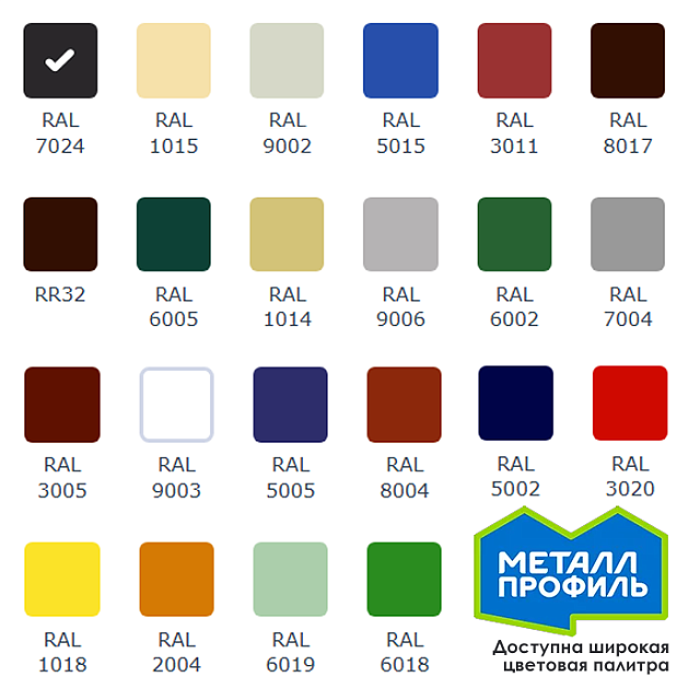В интернет-магазине dsc.by представлены отдельные позиции металлочерепицы для ознакомления с ассортиментом. В офисах продаж доступны образцы продукции, а под заказ возможно изготовление металлочерепицы МеталлПрофиль практически в любом цвете по каталогу RAL, с необходимым профилем волны, толщиной стали и типом покрытия.